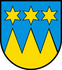 In Blau drei gelbe Spitzen, überhöht von drei sechsstrahligen gelben Sternen.